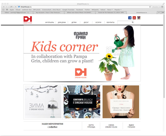 From 2013 to 2014 I worked as a freelance in-house designer at a Barcelona based ad agency Story & Co. Story & Co primarily specializes in design for commercial shopping centers – consequently large part of my work, as part of a small four-person design team, included large scale environmental design, social media campaigns, seasonal design campaigns for shopping centers, copy writing, and everything in between. As a russian speaker my focus was on two Moscow-based shopping centers – Vremena Goda and Dream house, as well as Berlin-based Wia. Bellow are some of samples from Dream House focused projects.